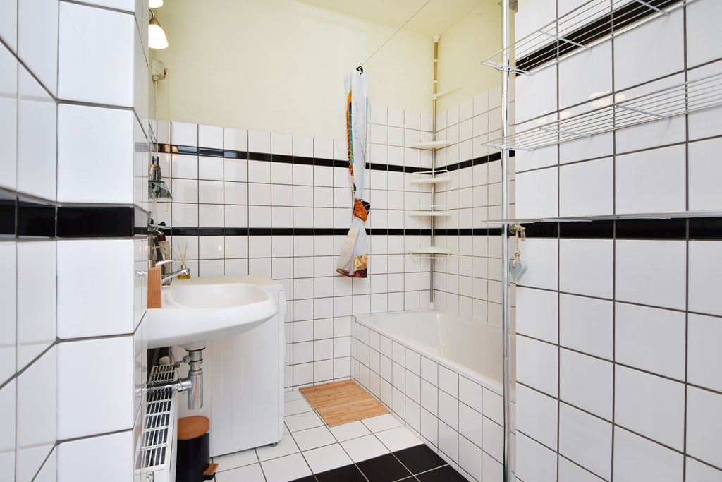 Tussen de slaapkamers in ligt de badkamer. Deze is uitgerust met een ligbad met douche, vaste wastafel en aansluiting voor de wasmachine.