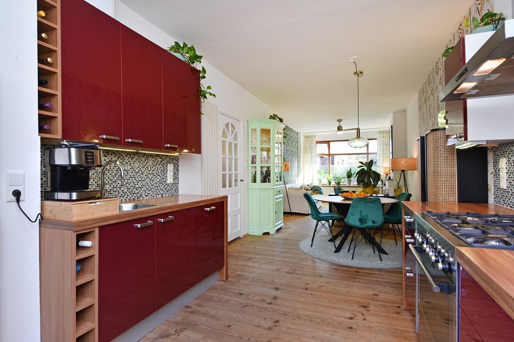 Entree op de begane grond met tochtportaal. Hal met meterkast en toilet. Ruime doorgebroken woonkamer met rustieke grenen houtenvloer en ruime open keuken aan de achterzijde. De keuken is voorzien van een vaatwasser, grote oven met 6pits gasfornuis, vrijstaande koel-/vriescombinatie, opstelplaats voor de C.V. ketel en wastafel met mengkraan. Middels de dubbele openslaande deuren toegang tot de verzorgde achtertuin.